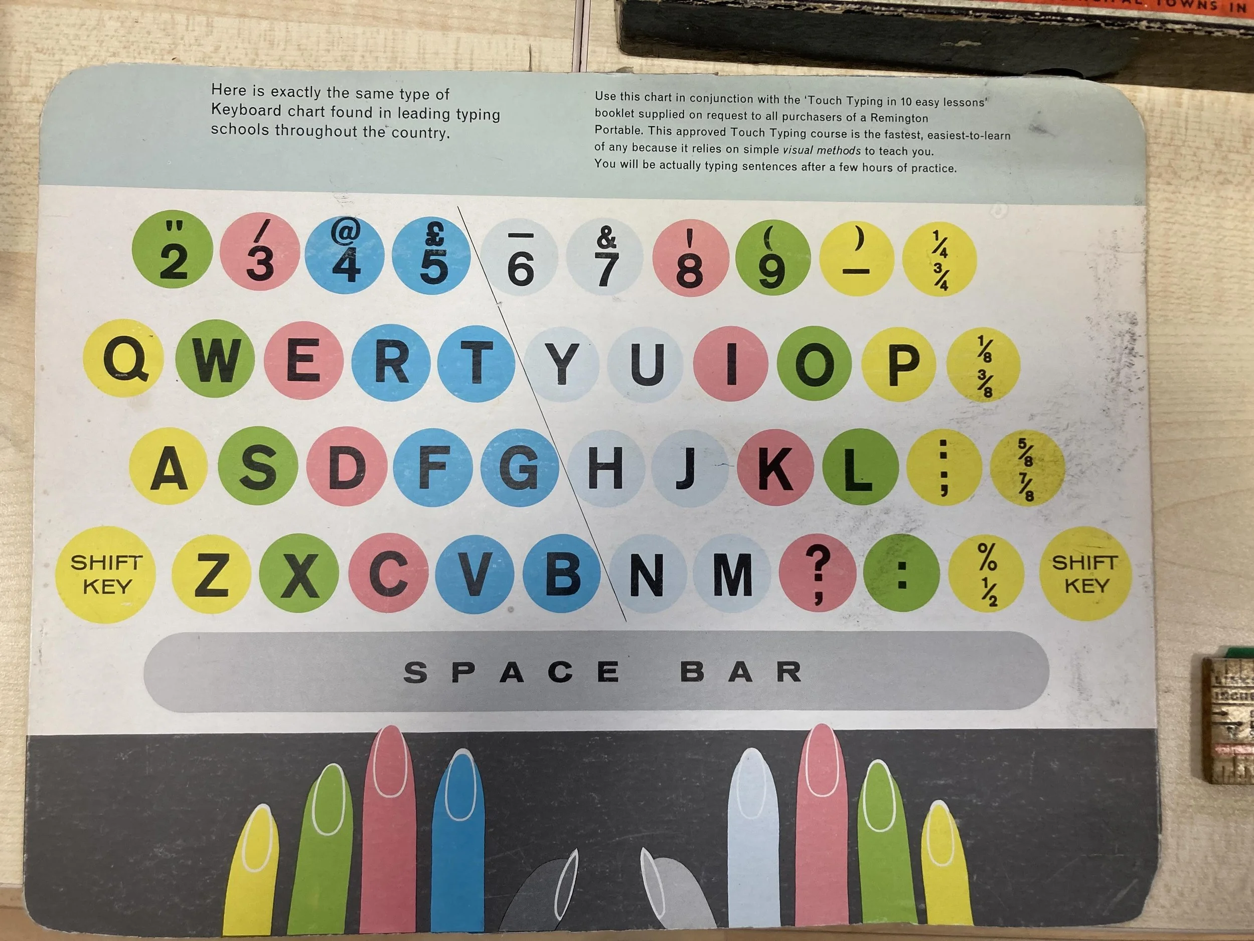 One woman remembered learning touch typing with a metal shield covering her fingers on the keys. She shared about lining up her hands from the outside of the machine with her pinkies and practicing to type by feel.